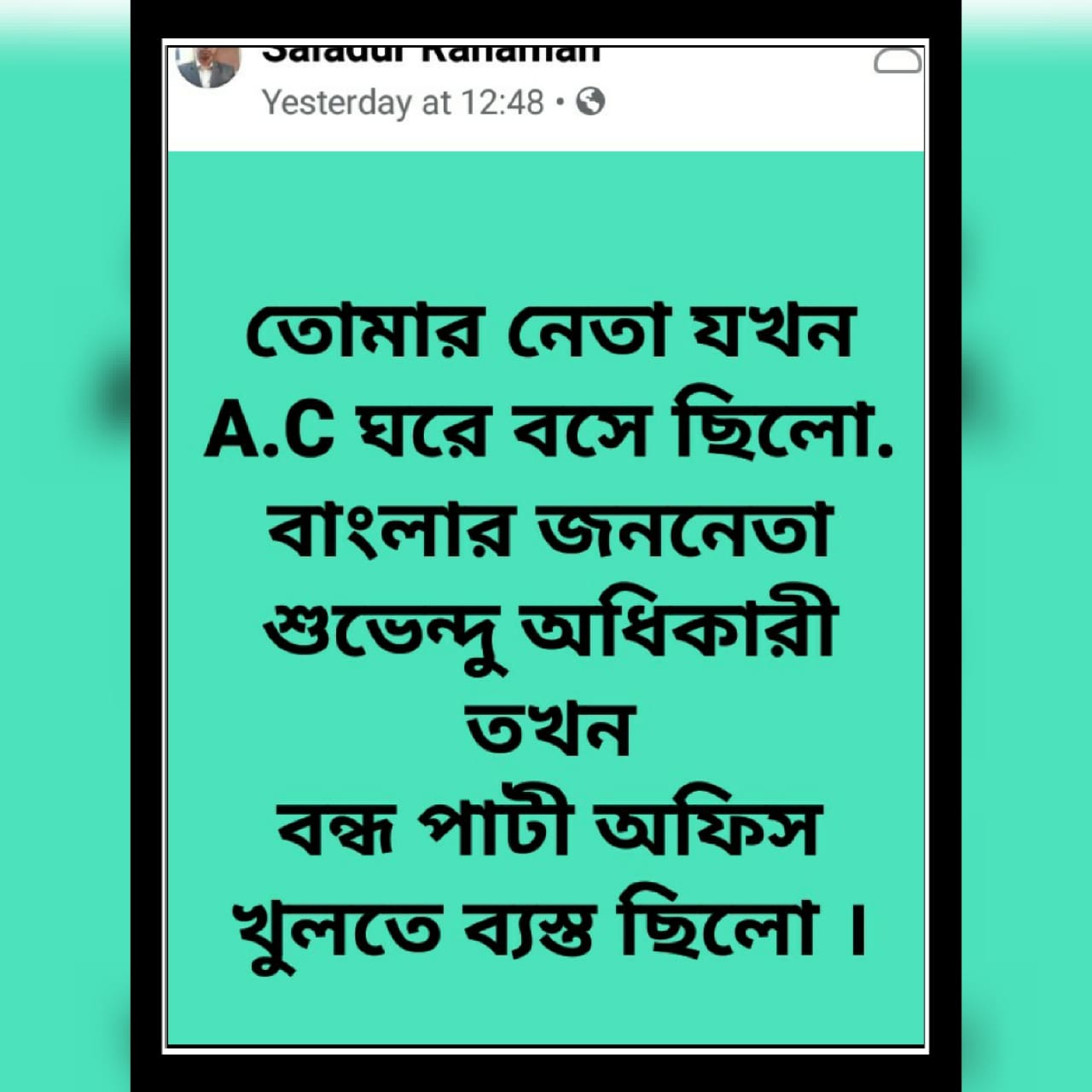 #শুভেন্দু_অধিকারী” নাম না করেই এক জায়গায় অভিষেককেই উদ্দেশ্যে করে পোষ্ট করা হয়েছে , ‘তোমার নেতা যখন A.C ঘরে বসে ছিলো.বাংলার জননেতা শুভেন্দু অধিকারী তখন বন্ধ পার্টিঅফিস খুলতে ব্যস্ত ছিল।”
