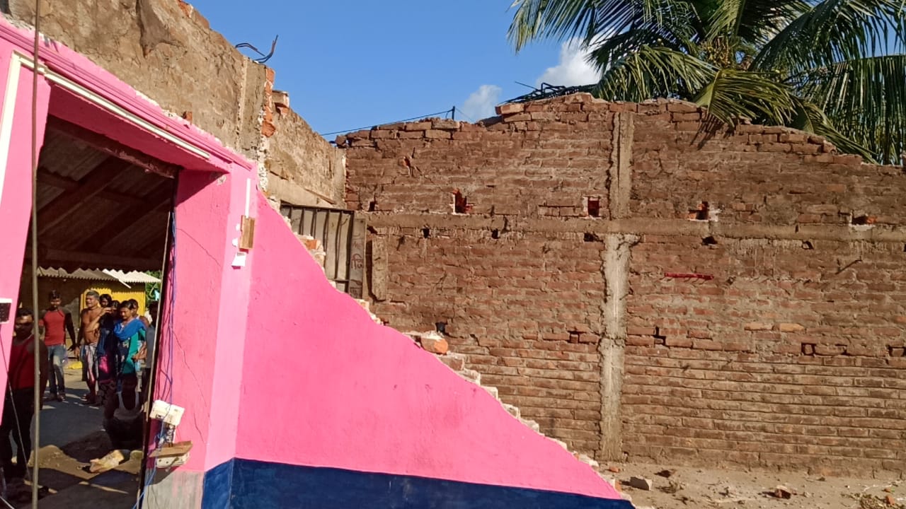 দুটি বাড়ীর ছাদ সহ সামনের দেওয়াল পুরোটাই ভেঙে নদী গর্ভে এবং কিছু অংশ ঐ ভেঙে পড়া সেতুর উপর।