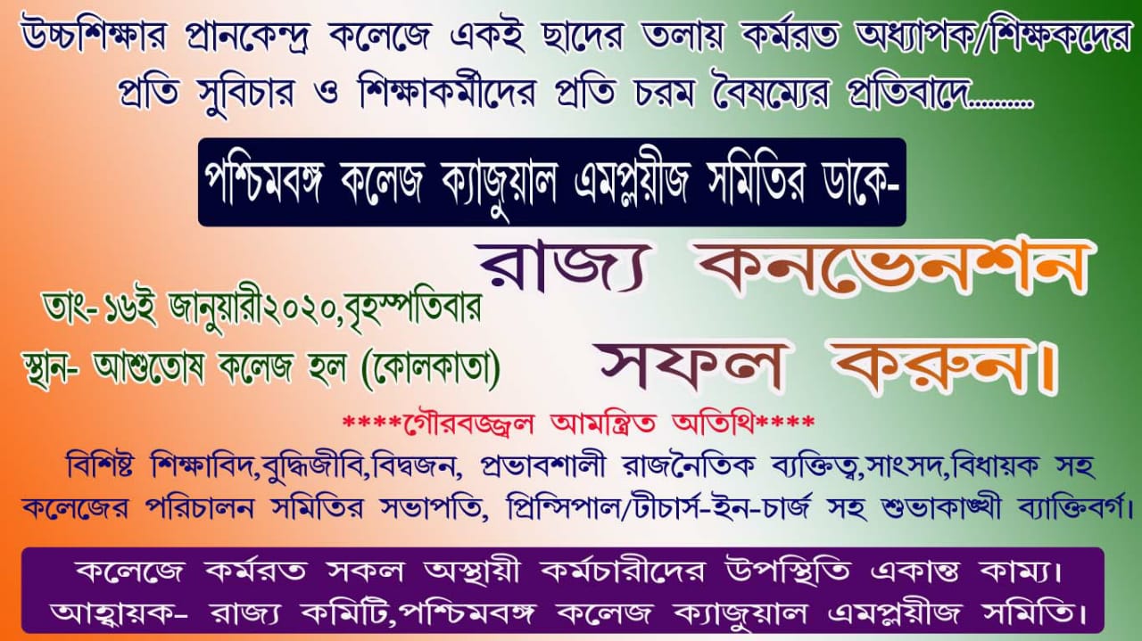 নিজস্ব সংবাদদাতা: নিজেদের অনিশ্চিত ভবিষ্যৎকে ঠেকাতে, কাজের নিরাপত্তা ইত্যাদির দাবিতে রাস্তায় নামার ডাক দিয়েছিলেন রাজ্যের কলেজ গুলির অস্থায়ী কর্মচারীরা। তাকেই আরও জোরদার করতে রাজ্য ব্যাপী কনভেনশন করতে চলেছে অস্থায়ী কলেজ কর্মীদের রাজ্য সংগঠন। আগামী ১৬ই জানুয়ারি কলকাতার আশুতোষ কলেজে সারাদিন ব্যাপী আলাপ আলোচনার পরই তাঁদের ভবিষ্যৎ আন্দোলনের রূপরেখা তৈরি হবে বলে জানিয়েছেন সংগঠনের নেতৃত্ব।
